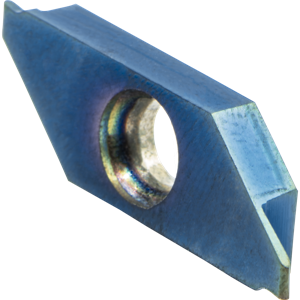 Grade:BLU; Style:Swiss Polygonal Lathe Insert (2 CutEdges / 1 Tooth); Machine:SWISS; Matl:CARBIDE; MaxCutDep:0.098"; 2 CutEdges; OAL:0.9843"; OAL:25.00mm; Rad(+/-.1"):00.0160"; Metric